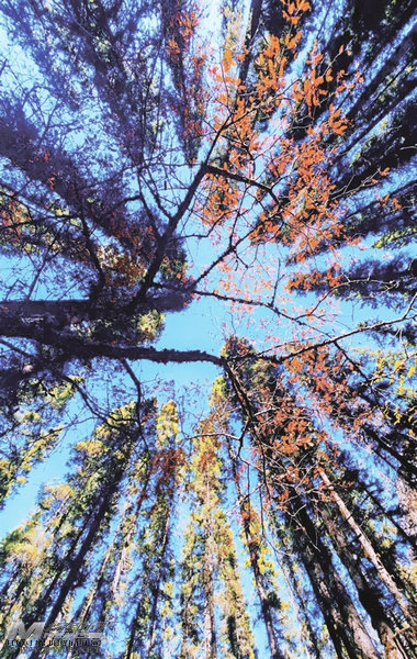 平武天母湖畔的彩林像天然調(diào)色盤?! ∮浾?任露瀟 攝
