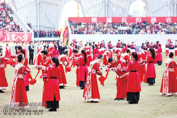 比賽中場(chǎng),在《綿陽(yáng)之戀》的優(yōu)美旋律中,50對(duì)新人舉行了集體婚禮。 記者 陳冬冬 攝