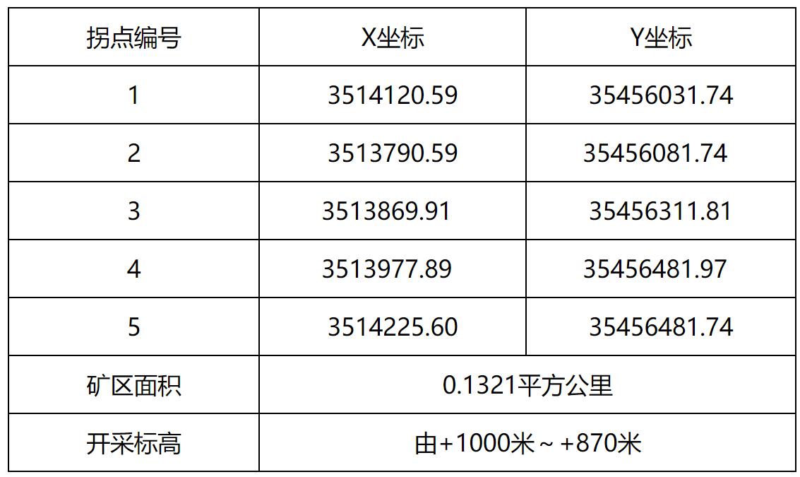 開(kāi)采范圍:0.1321平方公里,拐點(diǎn)坐標(biāo)如下(2000國(guó)家大地坐標(biāo)):