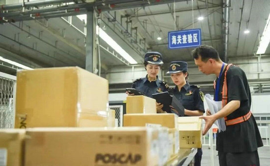 成都海關(guān)所屬雙流機(jī)場海關(guān)關(guān)員正在查驗(yàn)成都航空口岸進(jìn)出口貨物(圖源成都發(fā)布)