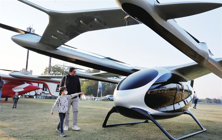 11月22日,在峰飛航空全球科技日活動(dòng)上,人們觀看電動(dòng)垂直起降飛行器。 新華社記者 方喆 攝