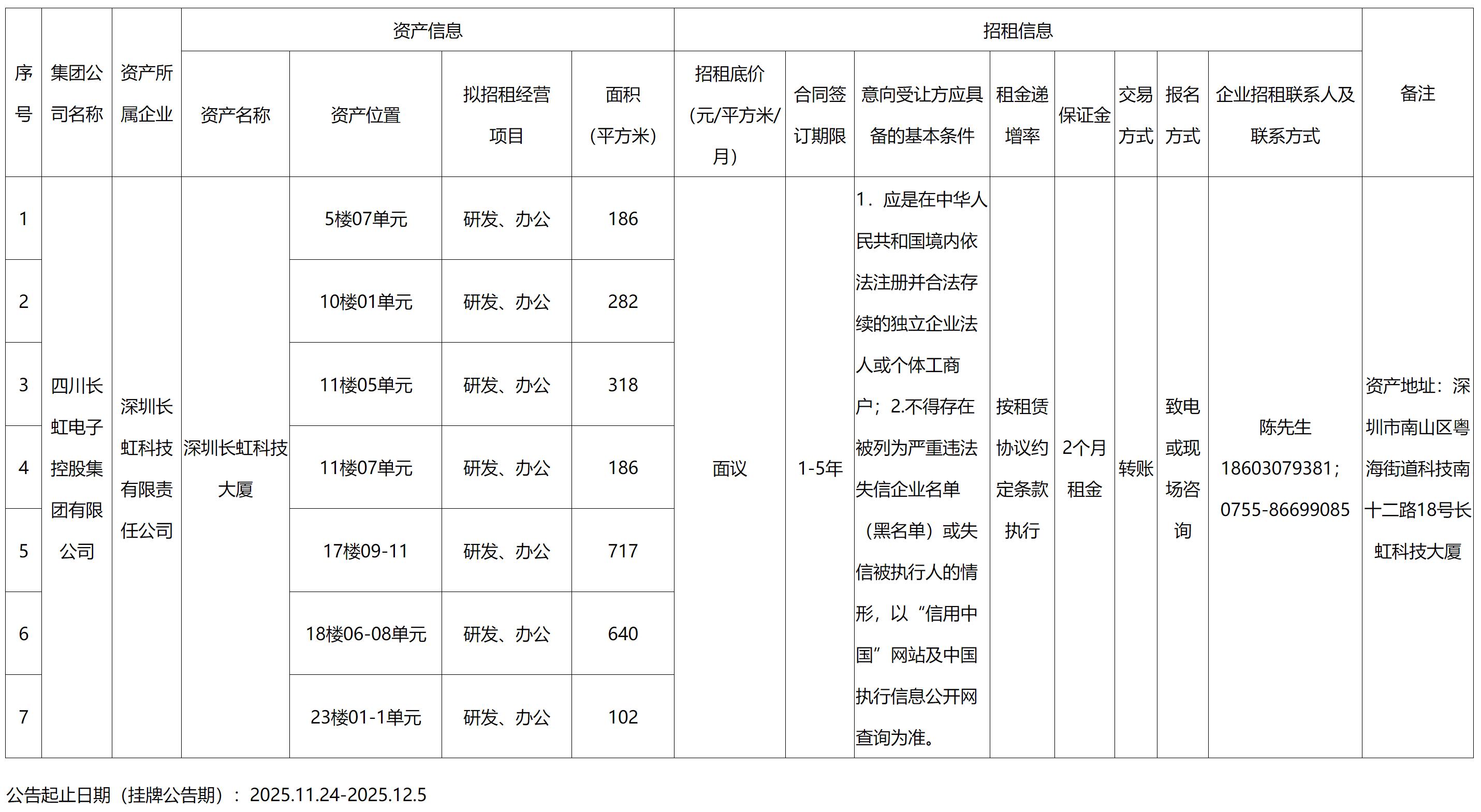深圳長虹科技有限責(zé)任公司資產(chǎn)出租公告