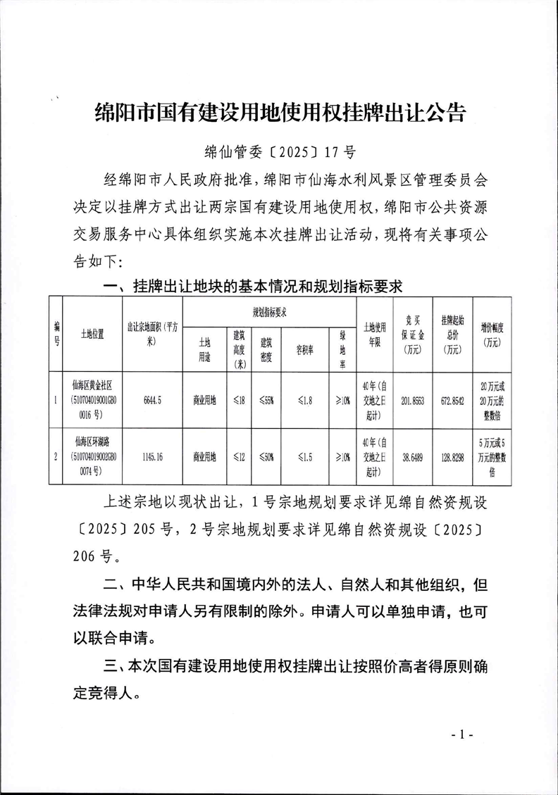 綿陽(yáng)市國(guó)有建設(shè)用地使用權(quán)掛牌出讓公告(綿仙管委〔2025號(hào)〕17號(hào))