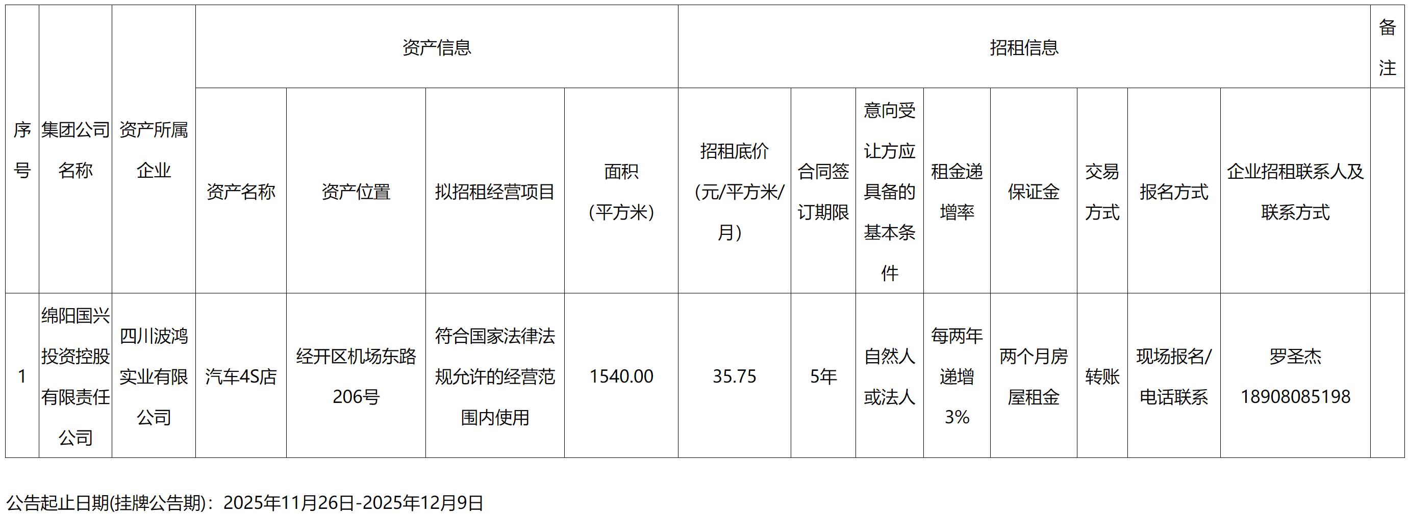 綿陽國興投資控股有限責任公司資產出租公告