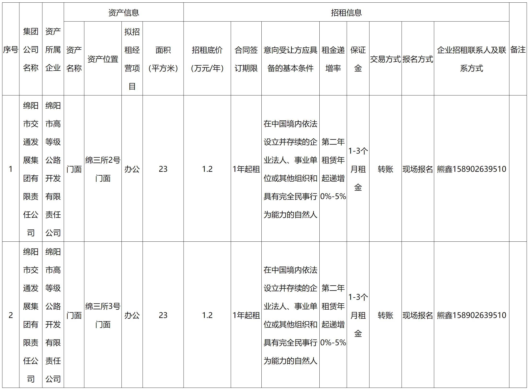 綿陽市高等級公路開發(fā)有限責任公司關(guān)于部分經(jīng)營性資產(chǎn)公開招租的公告