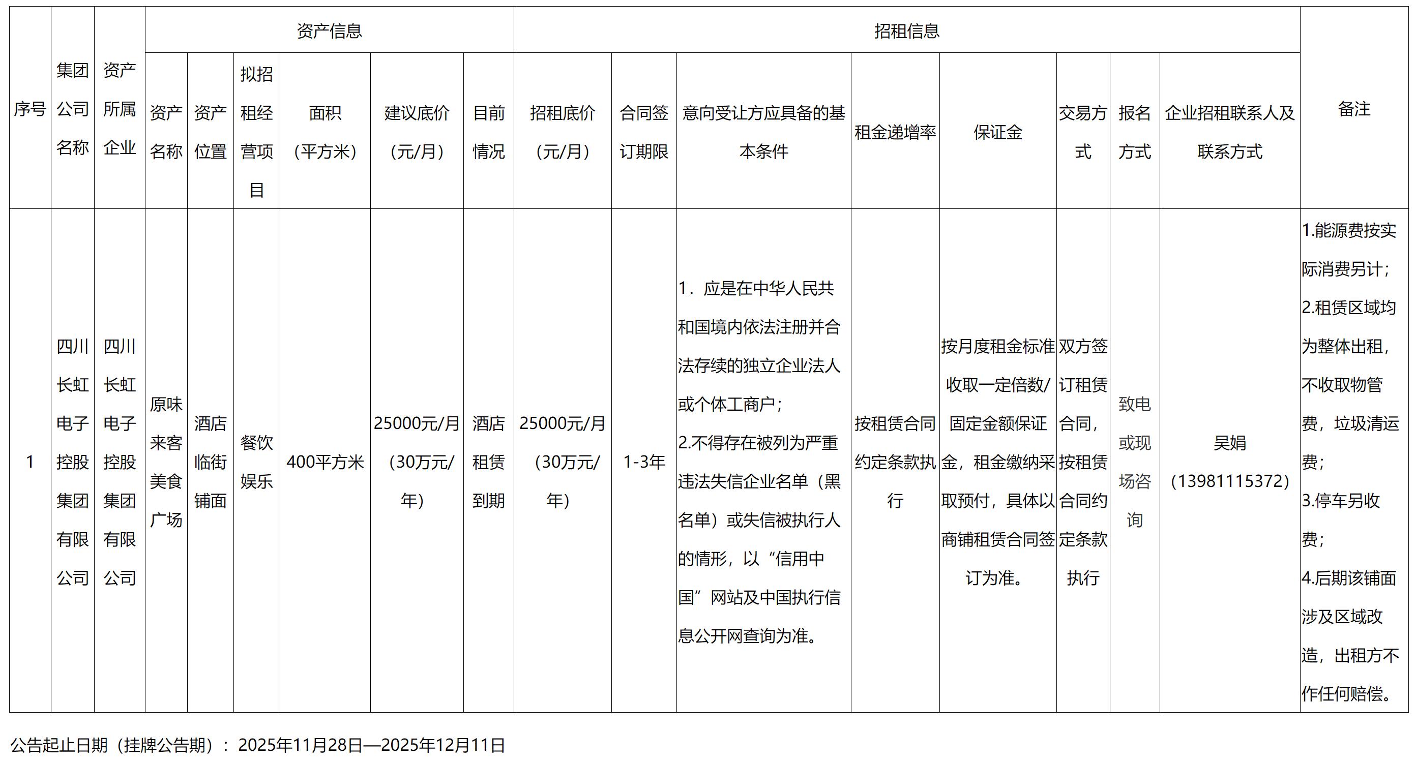 四川長(zhǎng)虹國(guó)際酒店有限責(zé)任公司資產(chǎn)出租公告