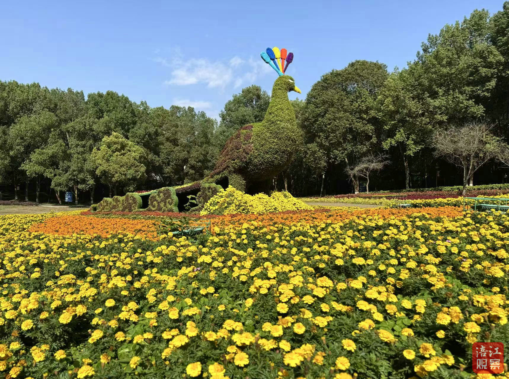 本屆菊展圍繞“一城秋色菊香滿園”主題,展出了球形菊、獨(dú)本菊、多頭菊、大立菊、塔菊、懸崖菊等盆景菊、藝菊10萬余株,涵蓋國華芳菊、帥旗、白雪公主等品種近500個(gè),搭配孔雀草、彩葉草、一串紅、赤壁等草本花卉10萬余盆,精心打造“一城秋色菊香滿園”“禮贊和平”“富樂菊圃”“龍鳳呈祥”“神秘古蜀”“安逸四川樂游綿陽”等12組特色造型。同時(shí),采用滴灌系統(tǒng)與霧化裝置,營造出云霧繚繞的朦朧意境,讓菊藝造型更顯靈動(dòng)。