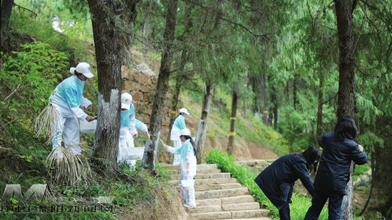 志愿者為古柏涂刷石灰。記者 劉曉東 攝