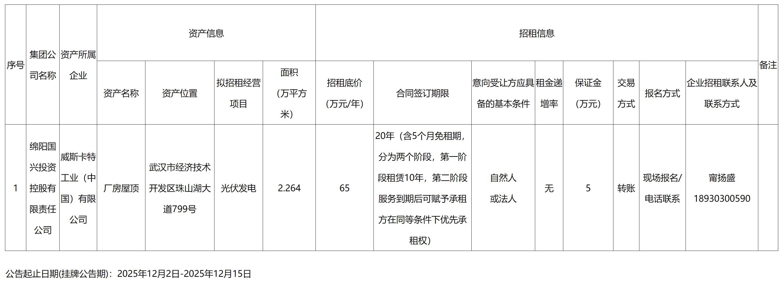 綿陽國興投資控股有限責任公司資產(chǎn)出租公告