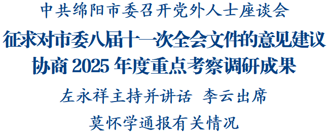中共綿陽市委八屆十一次全會(huì)舉行前夕,市委召開黨外人士座談會(huì),就全會(huì)文件聽取各民主黨派市(工)委會(huì)、市工商聯(lián)負(fù)責(zé)人和無黨派人士代表的意見和建議,并就2025年度重點(diǎn)考察調(diào)研成果進(jìn)行協(xié)商。省委常委、市委書記左永祥主持座談會(huì)并講話。