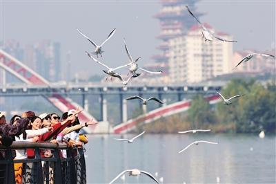 連日來,大批游客打卡三江半島,與紅嘴鷗互動嬉戲,成為獨特的城市風(fēng)景線。 記者 陳冬冬 攝