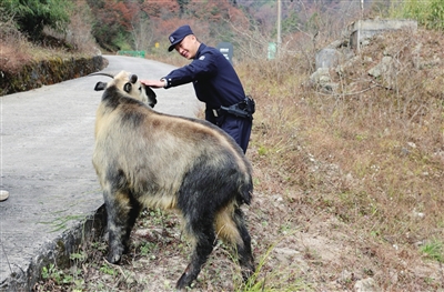 羚牛“王德福” 輕蹭民警的手