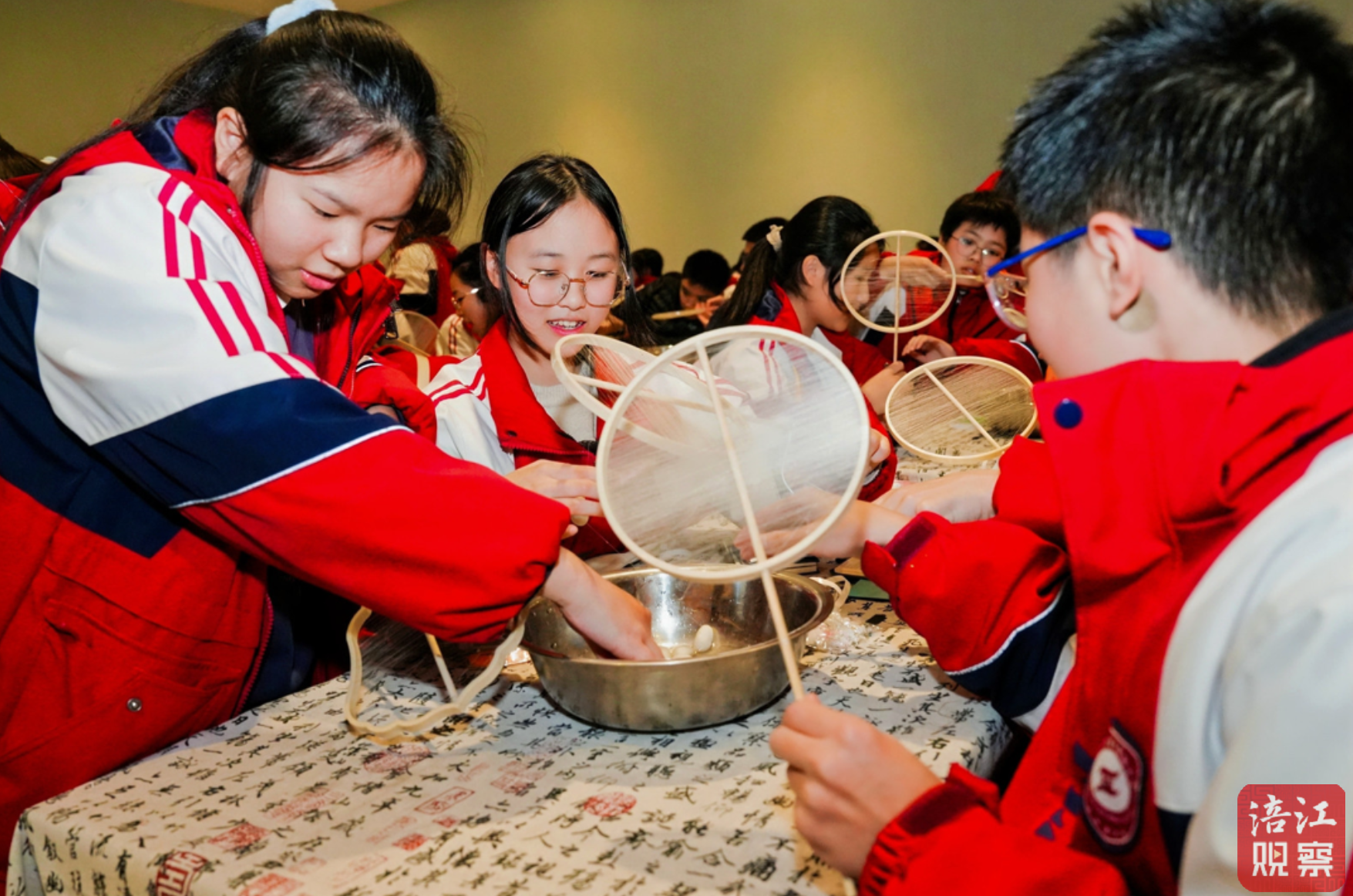冬日綿陽,鹽亭華夏母親嫘祖國(guó)家紀(jì)念公園的先蠶書院里卻暖意融融。“快看!絲抽出來了!”伴隨著陣陣驚呼,綿陽市富樂實(shí)驗(yàn)中學(xué)的學(xué)子們屏息凝神,將繅出的絲線仔細(xì)纏繞在素白扇骨上。不過半小時(shí),一把把泛著光澤的蠶絲團(tuán)扇就在少年們手中成型。