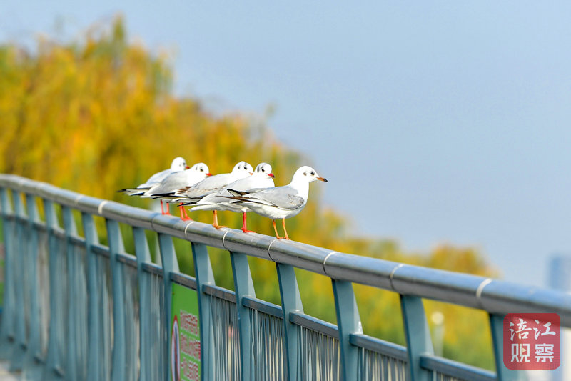 紅嘴鷗棲息在湖岸的欄桿上,悠閑地曬著太陽,偶爾展開潔白的羽翼,輕聲鳴叫,仿佛在享受這難得的溫暖時光。