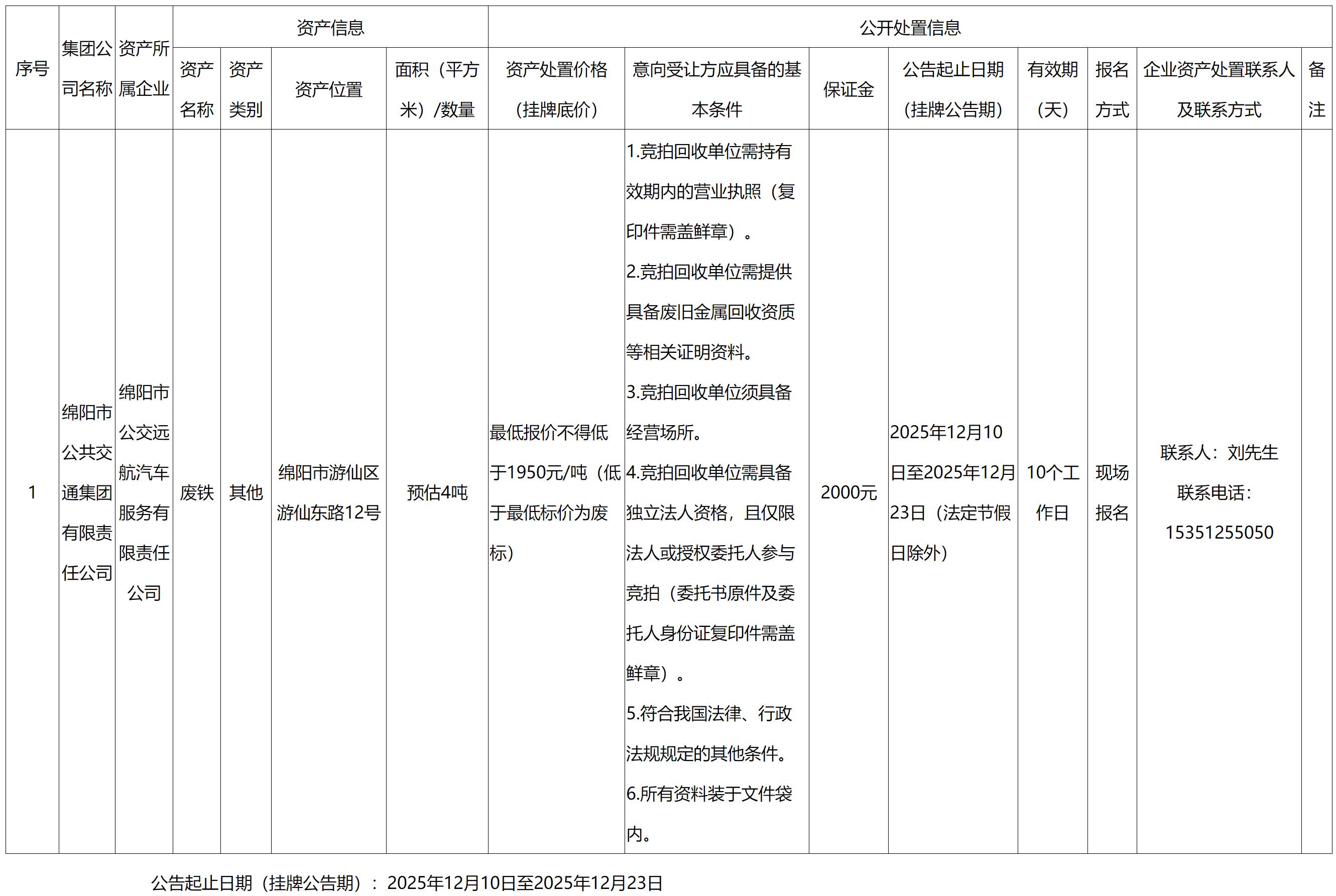 綿陽市公共交通集團(tuán)有限公司資產(chǎn)處置公告