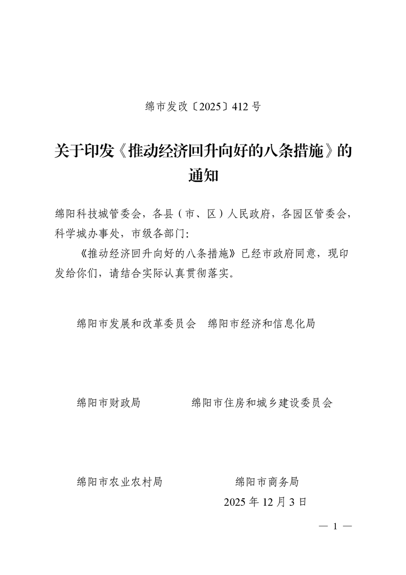綿陽(yáng)市發(fā)展和改革委員會(huì) 綿陽(yáng)市經(jīng)濟(jì)和信息化局 綿陽(yáng)市財(cái)政局 綿陽(yáng)市住房和城鄉(xiāng)建設(shè)委員會(huì) 綿陽(yáng)市農(nóng)業(yè)農(nóng)村局 綿陽(yáng)市商務(wù)局 關(guān)于印發(fā)《推動(dòng)經(jīng)濟(jì)回升向好的八條措施》的通知
