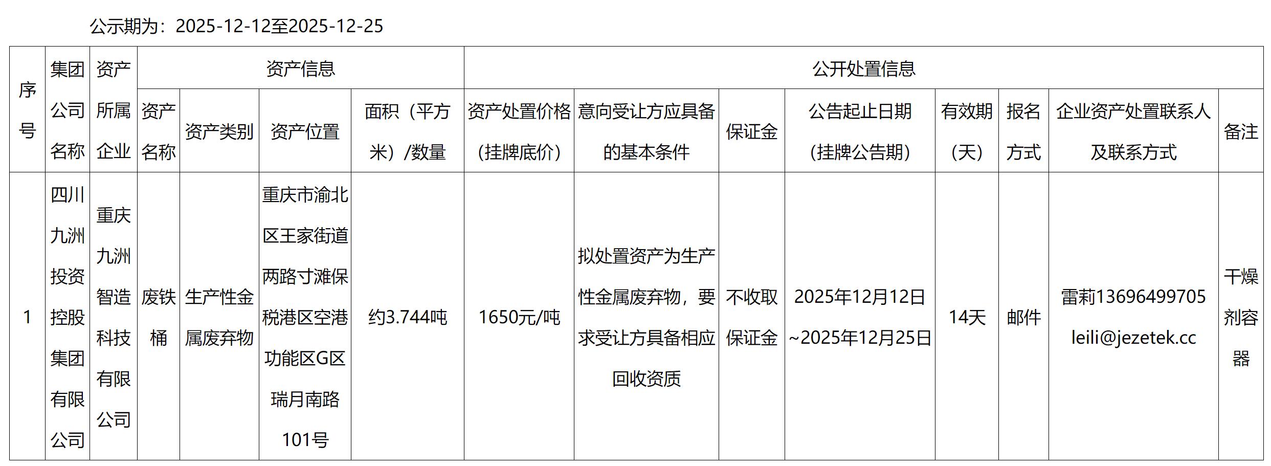 重慶九洲智造科技有限公司資產(chǎn)處置公告