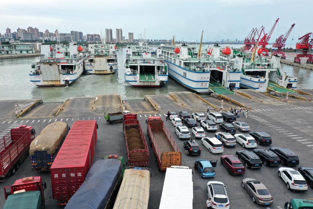 在海南省??谑行阌⒏?,客滾船在裝卸乘客、車輛(無人機照片)。新華社記者 郭程 攝