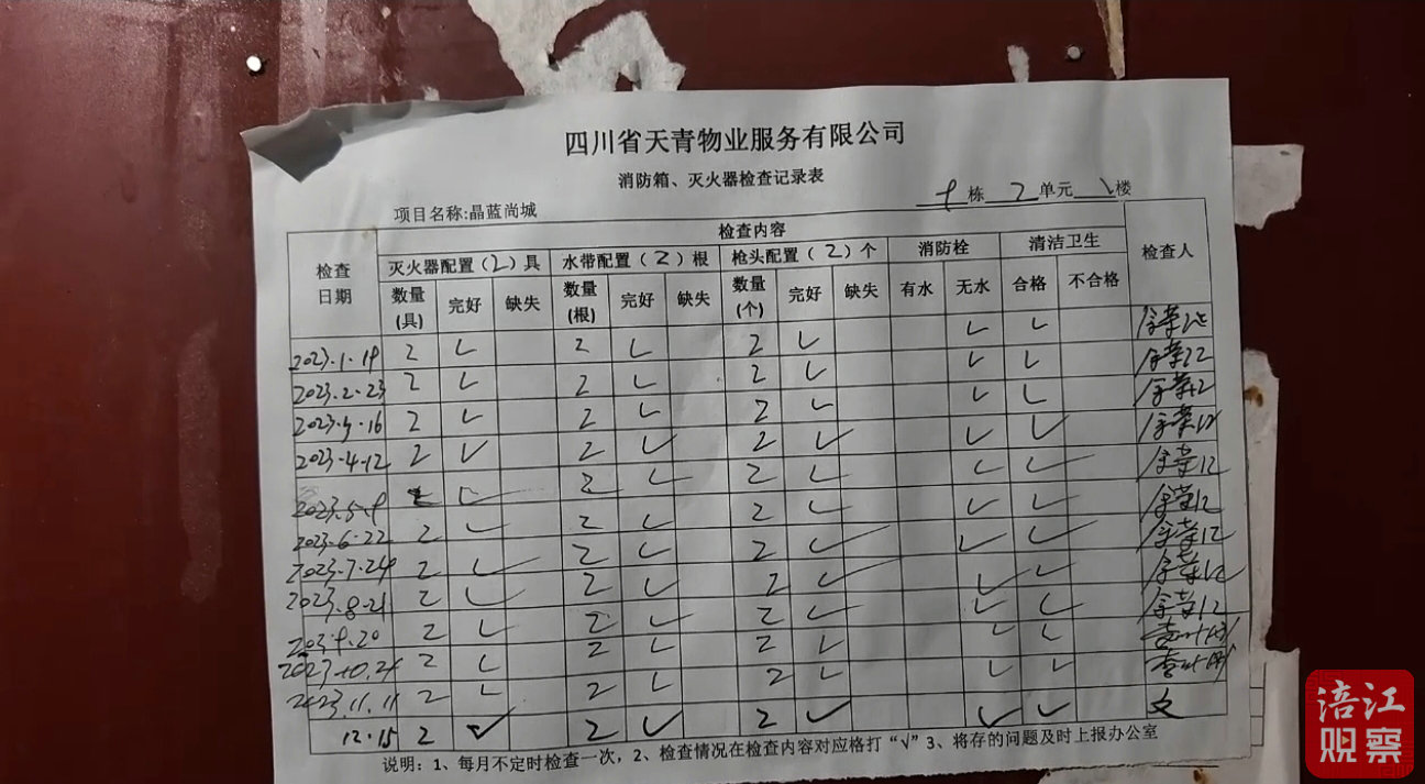 記者實地查驗發(fā)現(xiàn),該小區(qū)消火栓內(nèi)的消防水管嶄新,無使用痕跡,打開后卻沒有水流。而消火栓上張貼的物業(yè)巡查臺賬顯示,早在2023年,該問題已被標注。