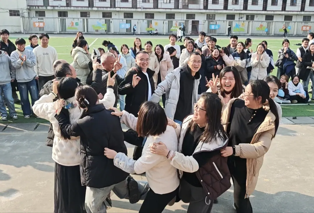 活動現(xiàn)場,師生全員投入游戲,歡聲笑語充盈整個操場。班主任化身“雞媽媽”全力守護學生,老師們組隊參與滾鐵環(huán)、編花籃活動,生疏卻默契的動作間,盡顯課堂之外的親和與活力。這場親切的互動,不僅有效拉近了師生距離,更讓備考學子真切感受到“我們始終同行”的溫暖與力量。