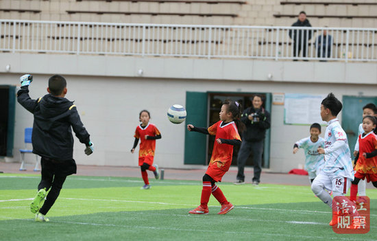 比賽一開(kāi)始,江油女足的小隊(duì)員們便開(kāi)始展現(xiàn)出較為嫻熟的足球技巧,他們?cè)谖迦酥谱闱驁?chǎng)上與同年齡段的男孩們奮力爭(zhēng)搶。別看孩子們小小的個(gè)子,面對(duì)雙語(yǔ)學(xué)校的男隊(duì)員,這些女孩一點(diǎn)也不膽怯,總是想方設(shè)法突破對(duì)方防守。對(duì)方有好幾次射門,大都被江油女足隊(duì)員防守成功,守門員也勇敢地奪下了幾次射門。雙方在球場(chǎng)上你拼我搶,幾乎可以說(shuō)勢(shì)均力敵。總的來(lái)看,這些小球員們的傳球、停球、射門技巧已經(jīng)有了較好的表現(xiàn)。