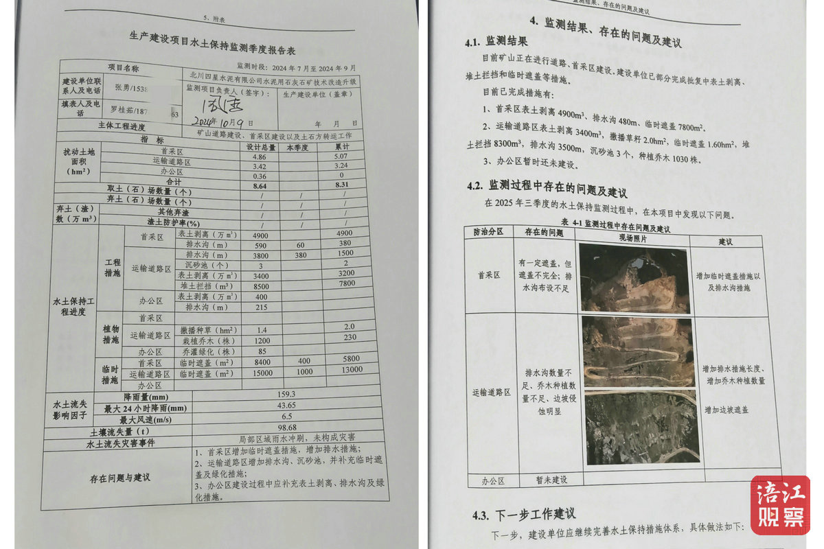 然而,記者查閱該礦山水土保持監(jiān)測(cè)季度報(bào)告發(fā)現(xiàn),從2024年第三季度開始,連續(xù)多期報(bào)告均指出“排水溝淤堵”“沉砂池淤積”“裸露邊坡未覆蓋”等問題,并附有現(xiàn)場(chǎng)照片。報(bào)告多次建議整改,但相同問題在后續(xù)報(bào)告中仍反復(fù)出現(xiàn)。