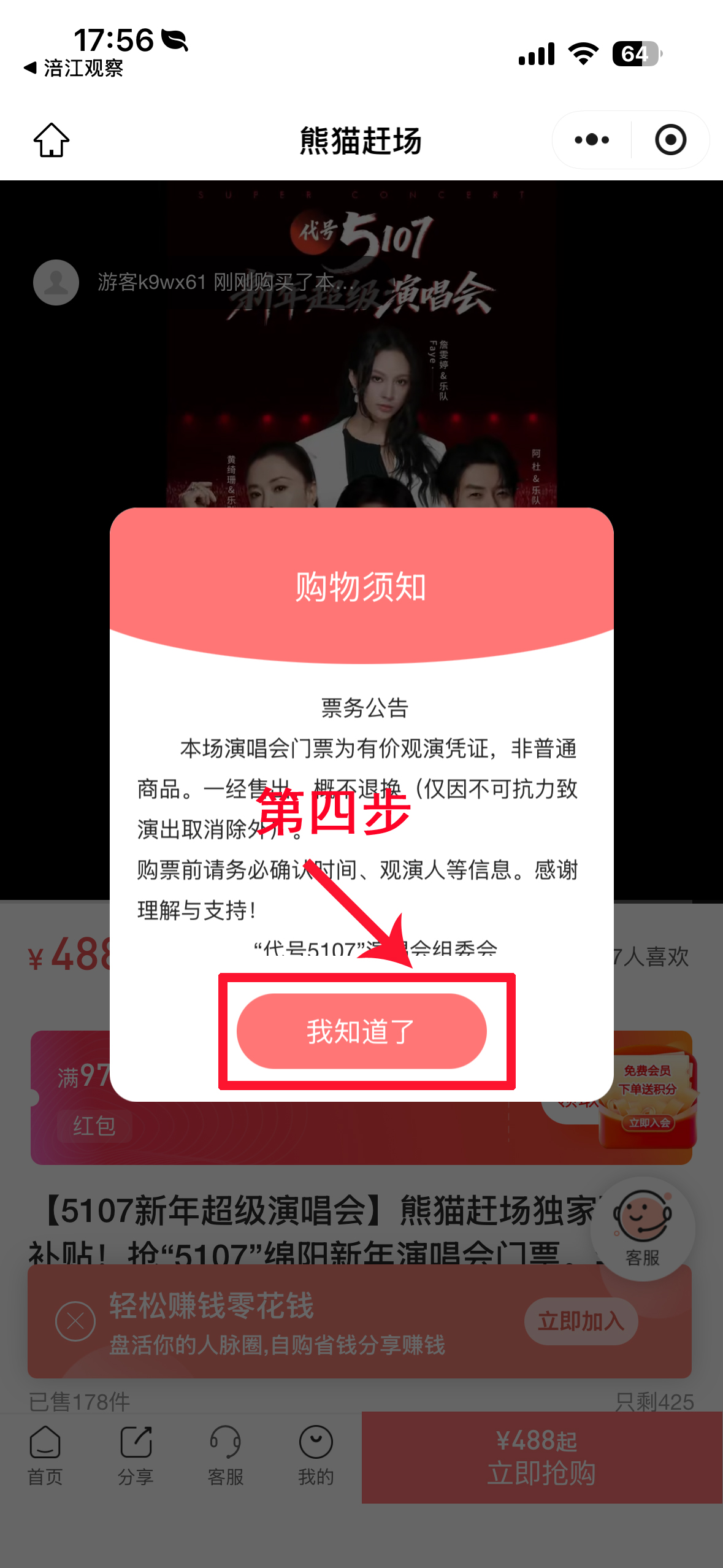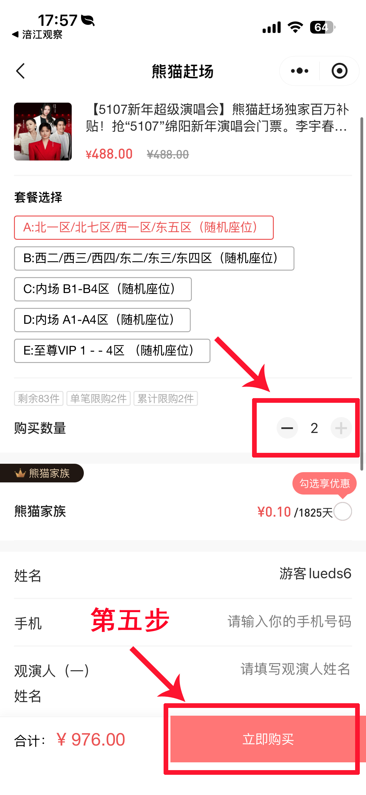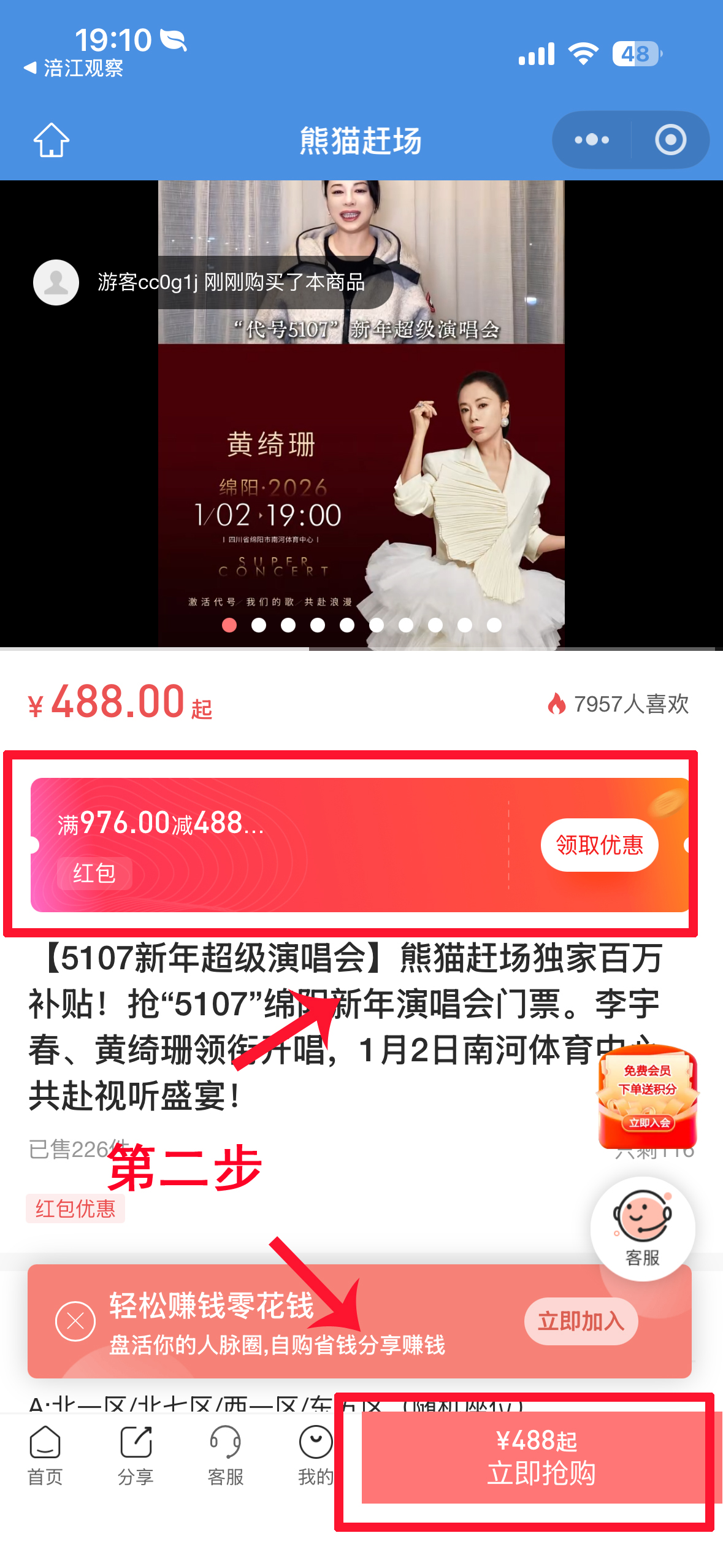 第二步:在“熊貓趕場”平臺先領(lǐng)取對應(yīng)價(jià)位的優(yōu)惠券,再點(diǎn)擊“立即搶購”,購買數(shù)量選擇“2”,即可享受買一贈一。