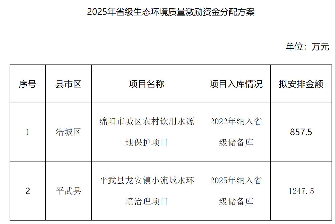 四川省財(cái)政廳、四川省生態(tài)環(huán)境廳以川財(cái)資環(huán)〔2025〕65號(hào)號(hào)下達(dá)我市2025年省級(jí)生態(tài)環(huán)境質(zhì)量激勵(lì)資金2105萬元。根據(jù)“資金跟著項(xiàng)目走”的要求,我局選取央省儲(chǔ)備庫(kù)符合資金分配條件的項(xiàng)目,會(huì)同綿陽(yáng)市財(cái)政局?jǐn)M定了資金分配方案,現(xiàn)予以公示。