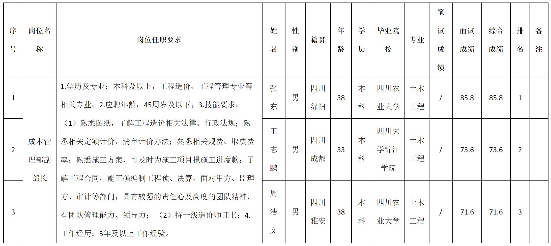 根據(jù)四川九洲建筑工程有限責(zé)任公司發(fā)布的招聘公告及招聘相關(guān)規(guī)定,現(xiàn)將測(cè)試成績(jī)予以公示。