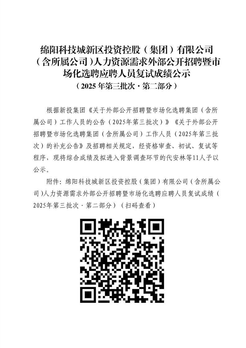 綿陽科技城新區(qū)投資控股(集團(tuán))有限公司(含所屬公司)人力資源需求外部公開招聘暨市場(chǎng)化選聘應(yīng)聘人員復(fù)試成績(jī)公示(2025年第三批次·第二部分)