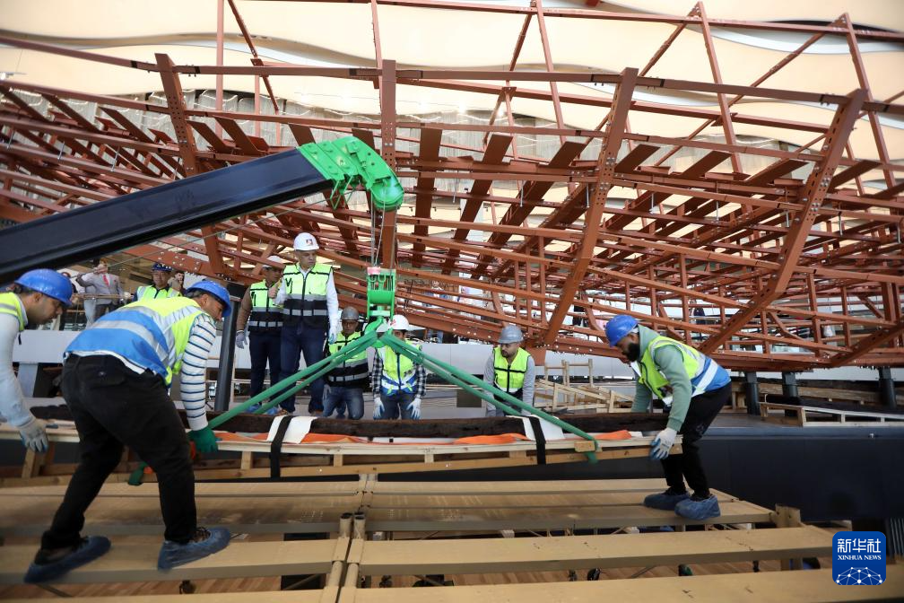 12月23日,在埃及吉薩的大埃及博物館胡夫太陽船展廳內(nèi),埃及修復(fù)團(tuán)隊開展古埃及法老胡夫第二艘太陽船的組裝工作。