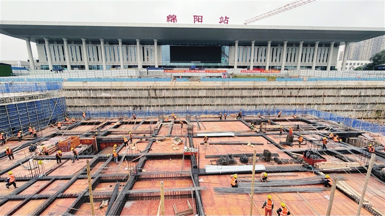 綿陽(yáng)火車站站前廣場(chǎng)北側(cè)2區(qū)段主體結(jié)構(gòu)順利封頂。 記者 唐韜 攝