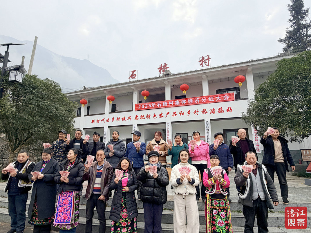 這里正在舉行的是石椅村2025年集體經(jīng)濟(jì)分紅大會(huì)。村干部念到名字,村民上前,按下紅手印,接過(guò)嶄新的鈔票,臉上綻放出燦爛的笑容。