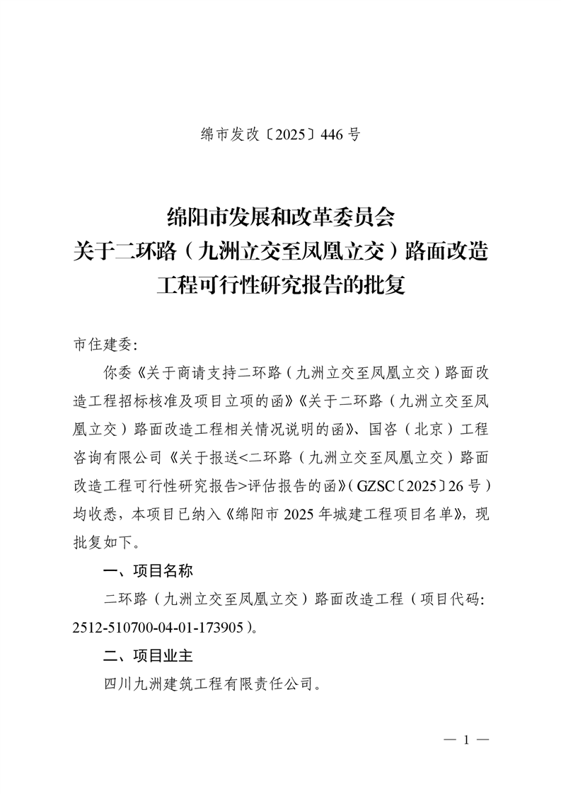 綿陽市發(fā)展和改革委員會關于二環(huán)路(九洲立交至鳳凰立交)路面改造工程可行性研究報告的批復
