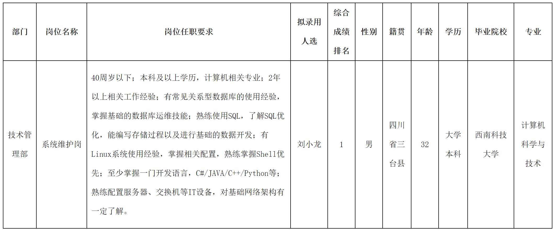 根據(jù)綿陽市綿州通科技有限責(zé)任公司發(fā)布的招聘公告及招聘相關(guān)規(guī)定,經(jīng)筆試、面試、體檢等程序,擬錄用劉小龍到綿陽市綿州通科技有限責(zé)任公司工作,現(xiàn)予以公示,具體情況如下: