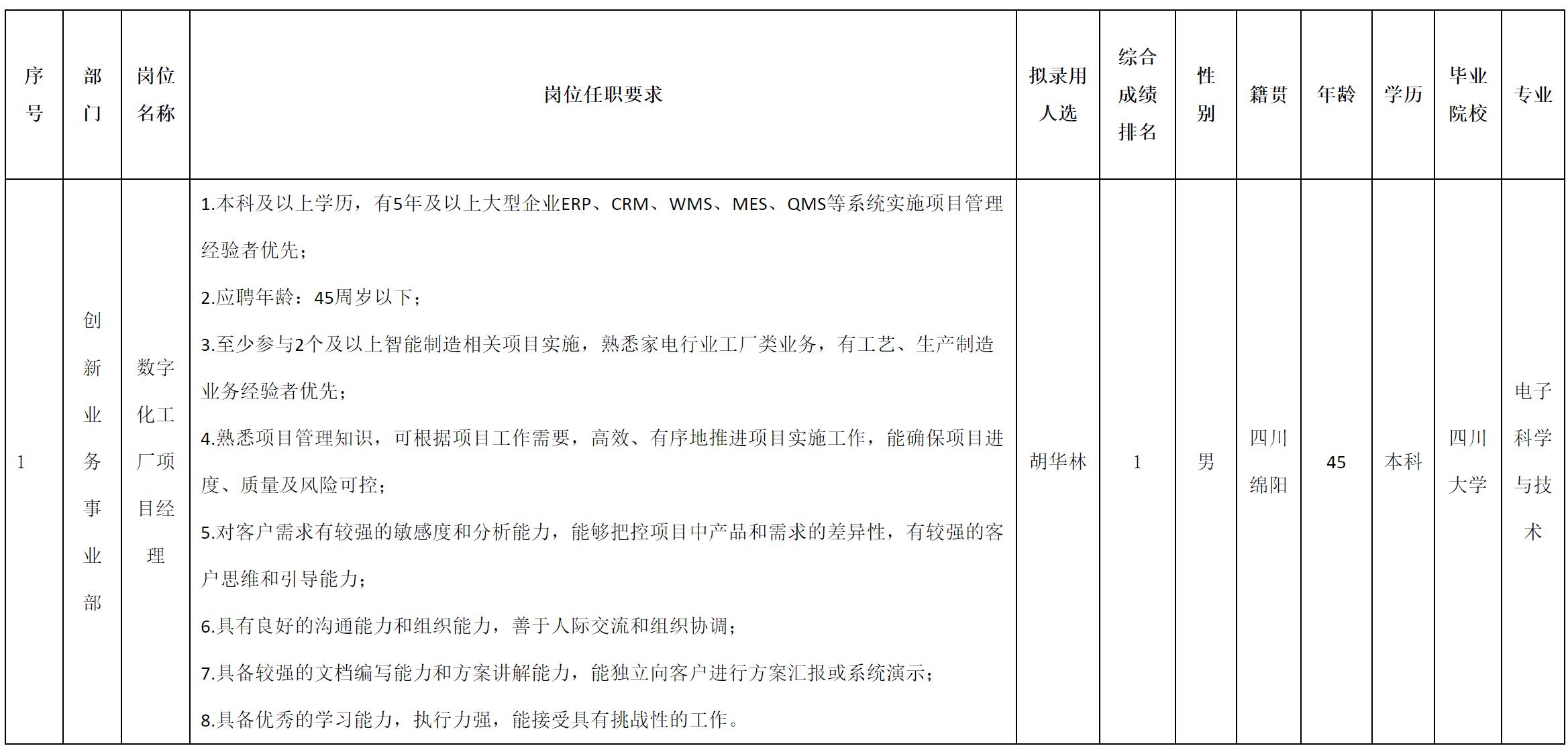 四川虹信軟件股份有限公司關(guān)于招聘數(shù)字化工廠項目經(jīng)理崗位擬錄用人員的公示