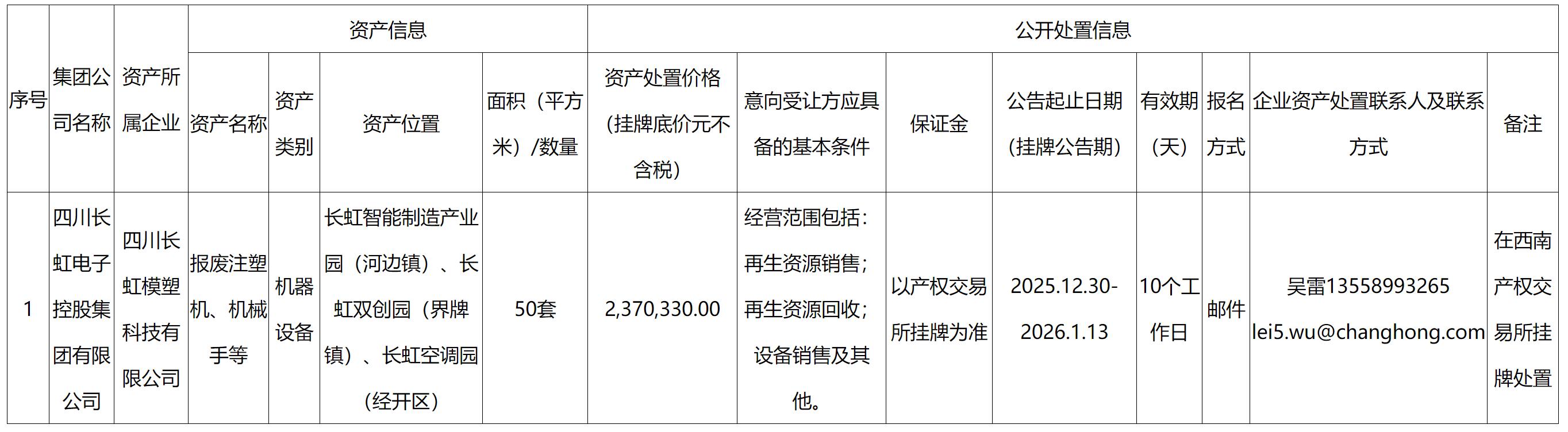 四川長虹模塑科技有限公司機器設(shè)備處置公告