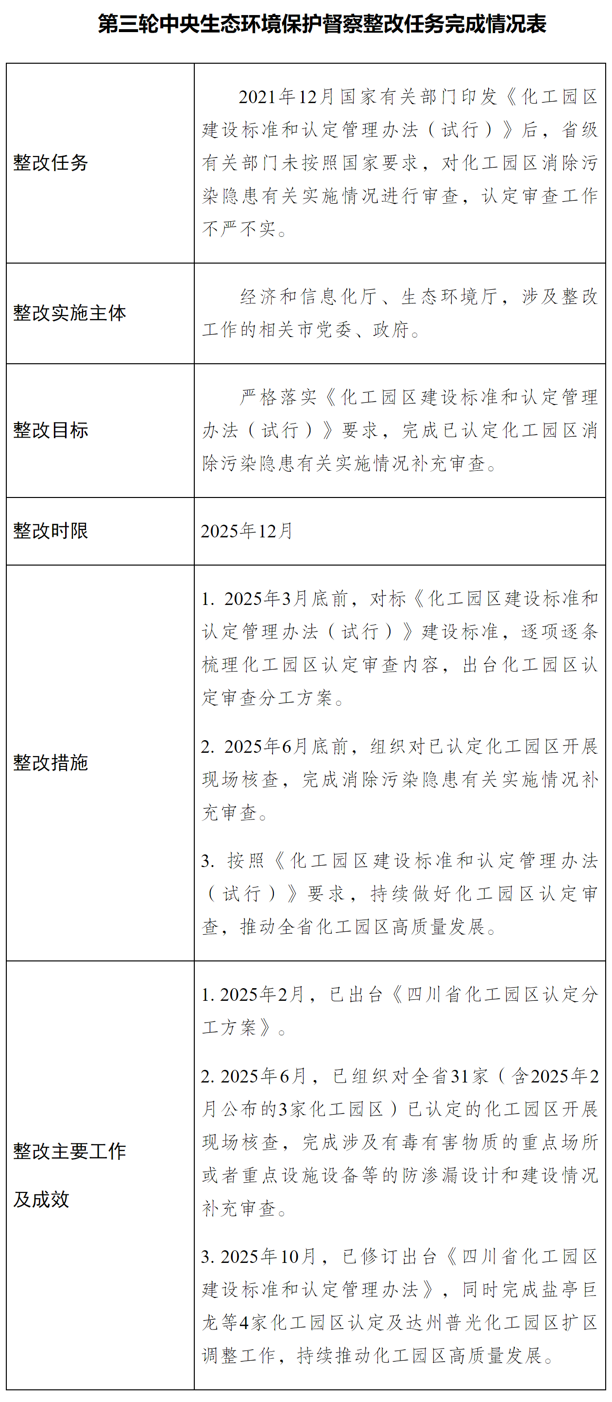第三輪中央生態(tài)環(huán)境保護(hù)督察“化工園區(qū)消除污染隱患實(shí)施情況審查”整改任務(wù)已完成,并通過驗(yàn)收,擬按程序?qū)嵤╀N號。根據(jù)《四川省生態(tài)環(huán)境保護(hù)督察問題整改銷號辦法(2025修訂)》有關(guān)要求,現(xiàn)將該項(xiàng)任務(wù)整改驗(yàn)收情況予以公示,公示期為2025年12月31日至2026年1月14日(十個(gè)工作日)。公示期間如有異議,請實(shí)名書面向四川省經(jīng)濟(jì)和信息化廳提出。