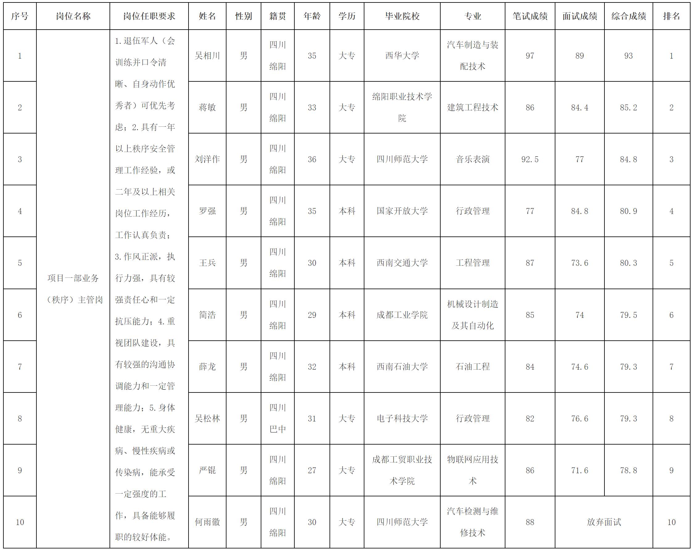 根據(jù)綿陽市康來物業(yè)服務(wù)有限公司發(fā)布的招聘公告及招聘相關(guān)規(guī)定,經(jīng)筆試、面試等程序,現(xiàn)將筆試(面試)成績予以公示。
