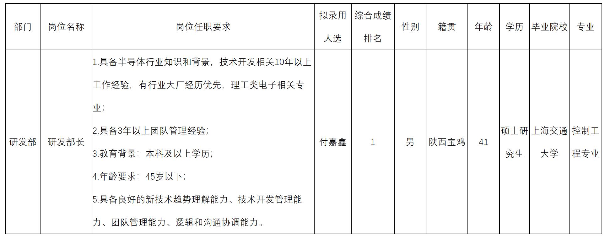 公示期為:2025年12月31日至2026年1月5日。公示期間,如有異議,請(qǐng)以電話(huà)、信函等方式向四川啟賽微電子有限公司人力資源部門(mén)反映。