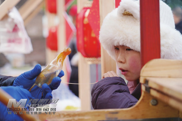 在潼川古城南外街的一家糖畫小攤邊,孩子們正認(rèn)真挑選著喜歡的圖案,完成后的糖畫在陽光照耀下晶瑩剔透、閃閃發(fā)光。老板劉云一邊繪制著蛇形圖案的糖畫,一邊介紹:“今年是蛇年,所以買蛇形圖案糖畫的顧客特別多,這幾天生意很好,一天能賣五六百元。”