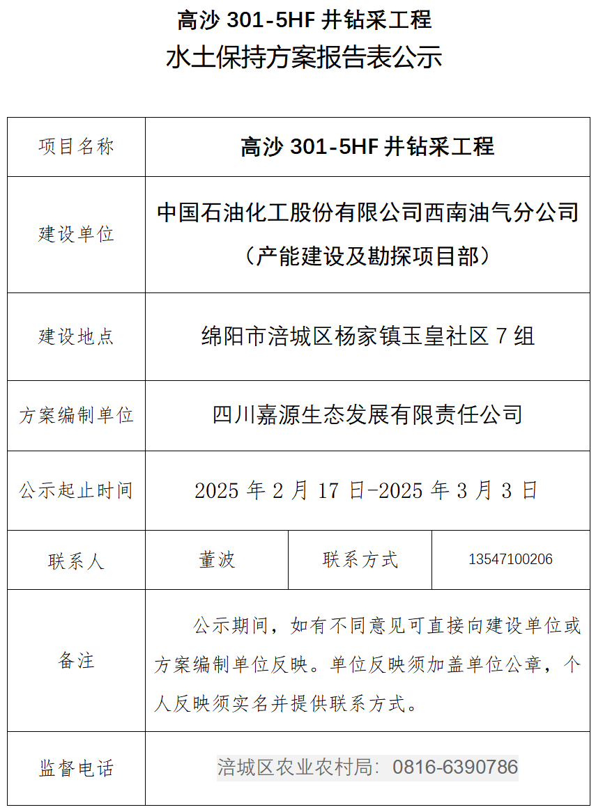 高沙301-5HF井鉆采工程水土保持方案報(bào)告表公示