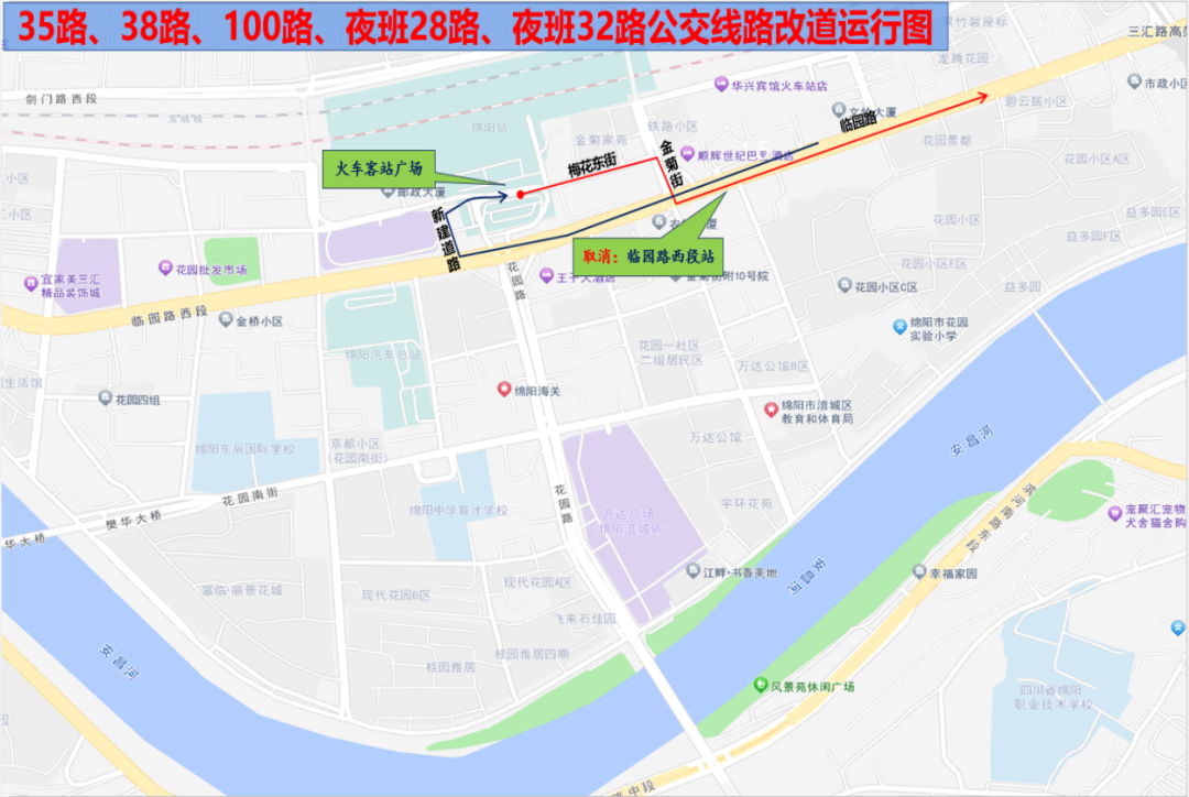 35路:火車客站廣場—沈家壩開元醫(yī)院。由火車客站廣場始發(fā),改道經(jīng)梅花東街、金菊街至臨園路回原線路運行;開往火車客站廣場方向運行路線不變。