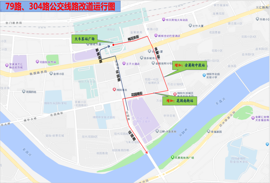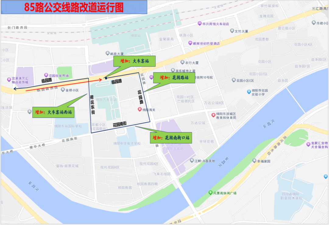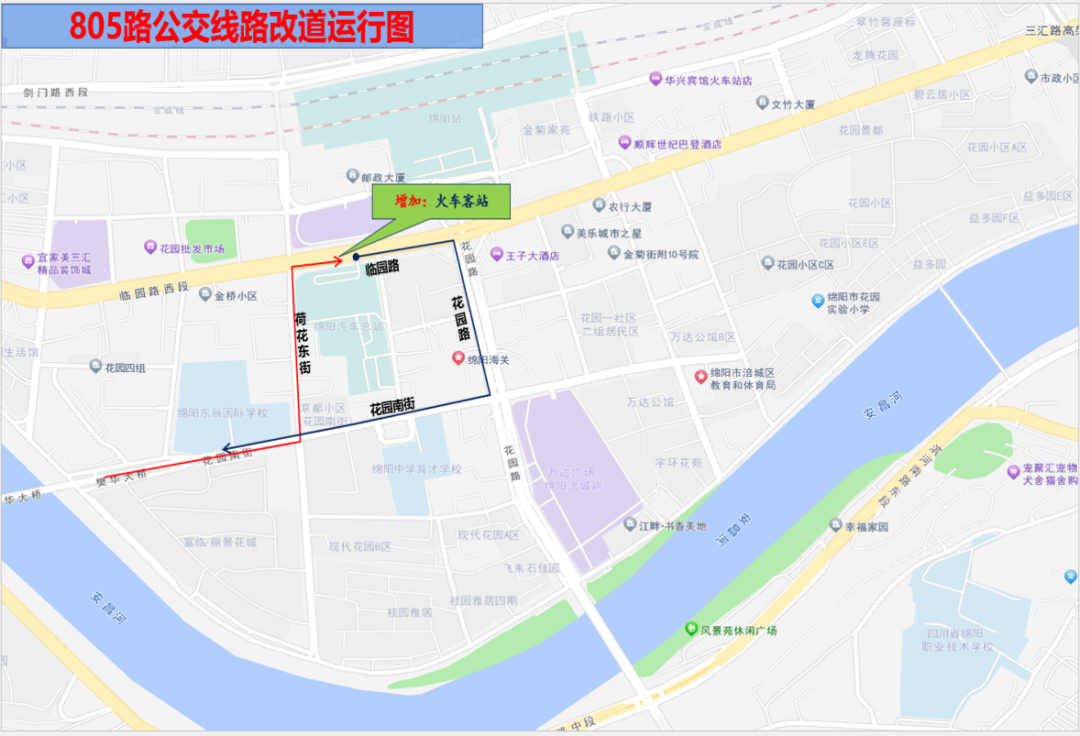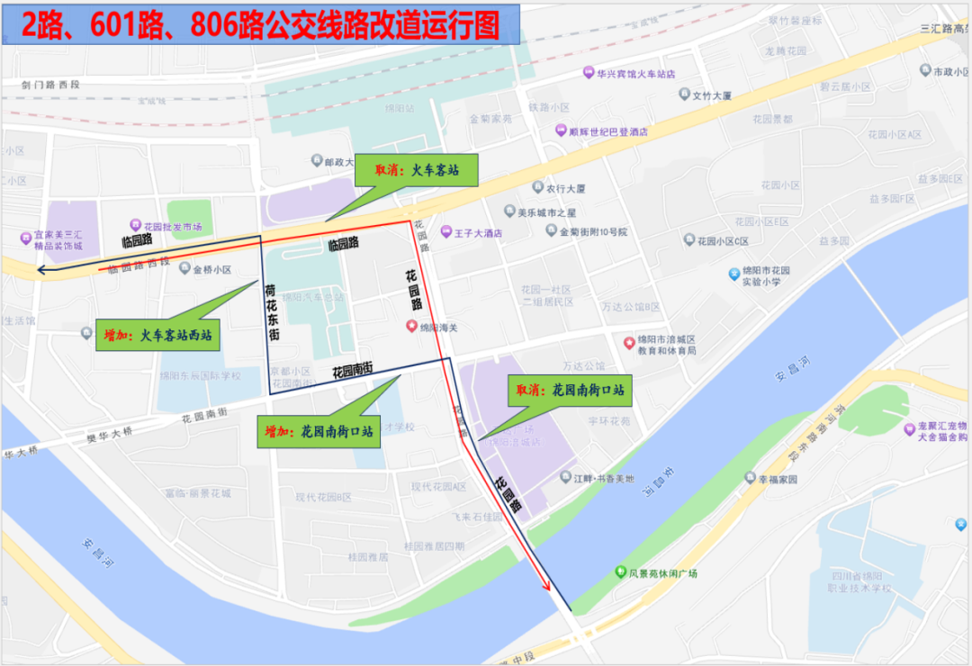 長虹智能產(chǎn)業(yè)園—火車客站(改道后)。開往火車客站方向,行至荷花東街??炕疖嚳驼疚髡竞?,改道經(jīng)臨園路至火車客站(汽車總站側(cè));返回經(jīng)花園路至花園南街回原線路運行。