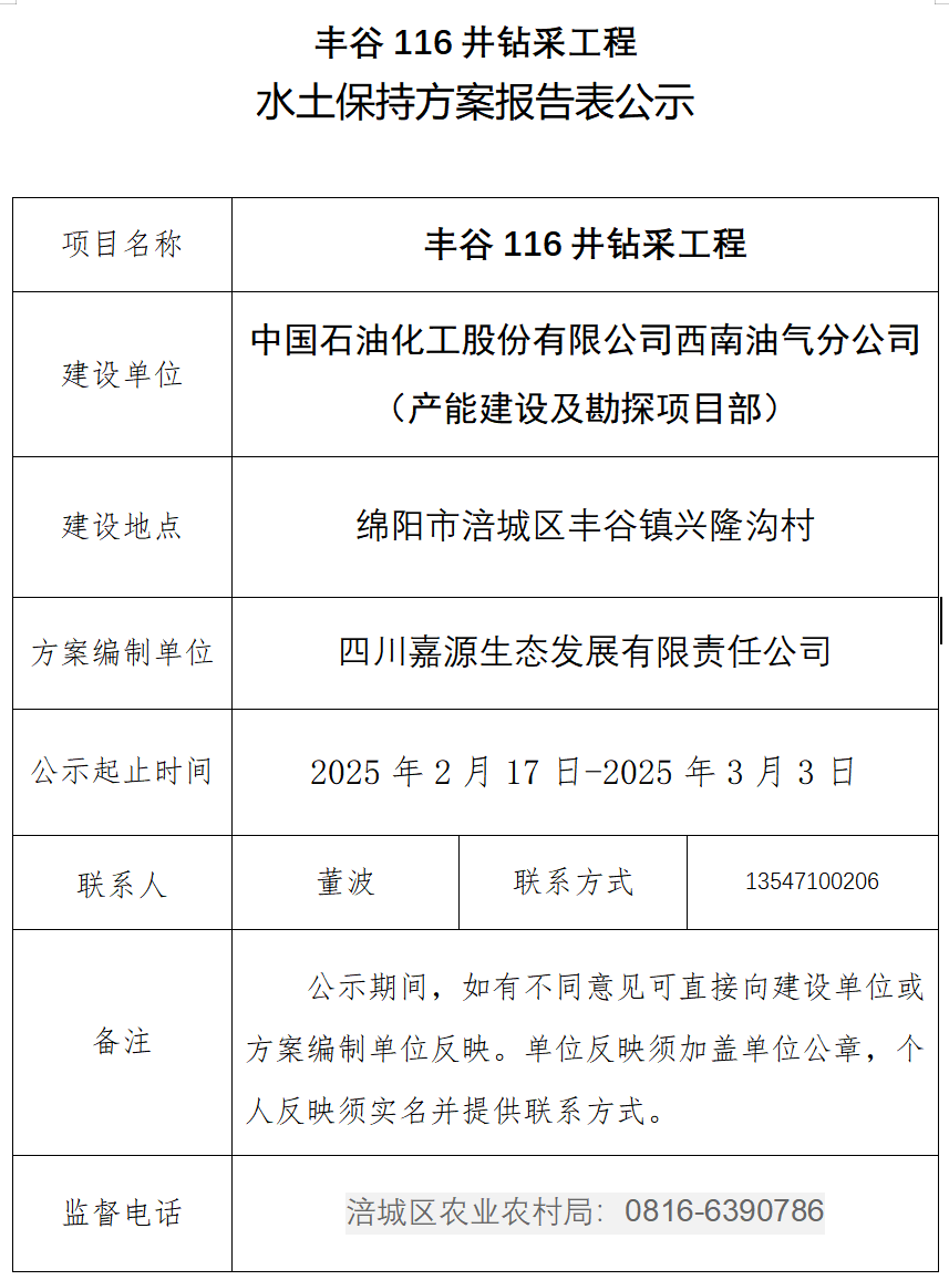 豐谷116井鉆采工程水土保持方案報告表公示