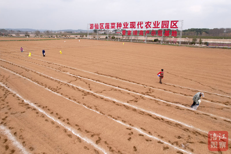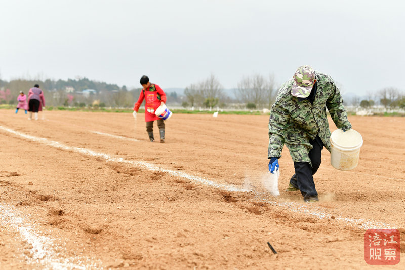 在油菜地的另一邊,農(nóng)戶們?cè)诿χN,拉標(biāo)線、撒底肥……松軟的泥土中嵌進(jìn)一串串深淺不一的腳印。
