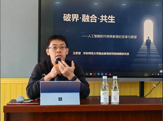 本次培訓以“破界·融合·共生——人工智能對特殊教育的變革與展望”為主題。由華東師范大學融合教育研究院特聘研究員、七維教育平臺負責人王彥堃擔任主講。培訓中,王彥堃教授憑借深厚的學術(shù)功底和豐富的實踐經(jīng)驗,為老師們深入剖析了人工智能技術(shù)在特殊教育領(lǐng)域的廣泛應用及其帶來的深刻變革。他從智能輔助教學、個性化學習路徑規(guī)劃、情感識別與干預等多個方面,展示了人工智能技術(shù)在提升特殊教育質(zhì)量和效率方面的巨大潛力。同時,王教授還展望了人工智能技術(shù)在特殊教育領(lǐng)域的未來發(fā)展趨勢,提出了“破界·融合·共生”的教育理念,鼓勵老師們積極擁抱新技術(shù),實現(xiàn)教育資源的優(yōu)化配置和教育質(zhì)量的全面提升。