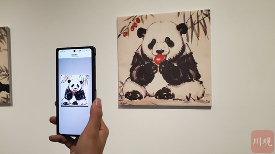 3月1日,“AI漩渦數字藝術展”在成都廣匯美術館啟幕。“AI漩渦數字藝術展”現場所展示的42組一百多幅繪畫作品都由AI輔助作者完成。通過手機掃描,畫上的熊貓“動”了起來。川觀新聞記者 韋維 攝