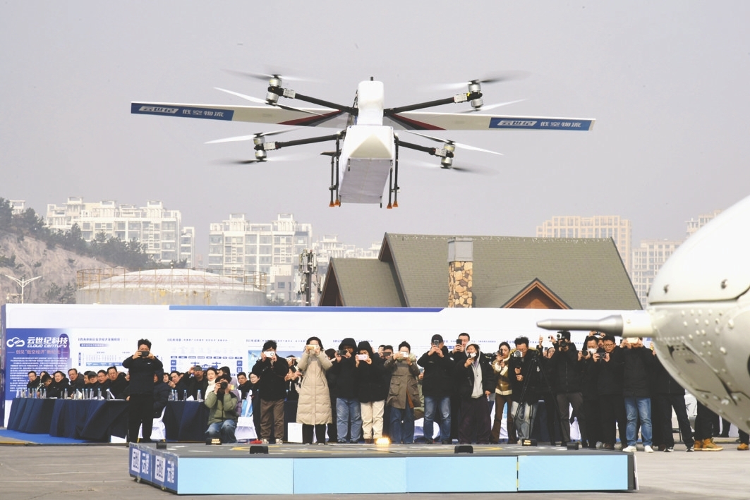2025年2月27日,青島首條海島低空物流航線開(kāi)通,從靈山島上飛來(lái)的無(wú)人機(jī)準(zhǔn)備降落在青島西海岸新區(qū)積米崖碼頭。(新華社記者李紫恒攝)