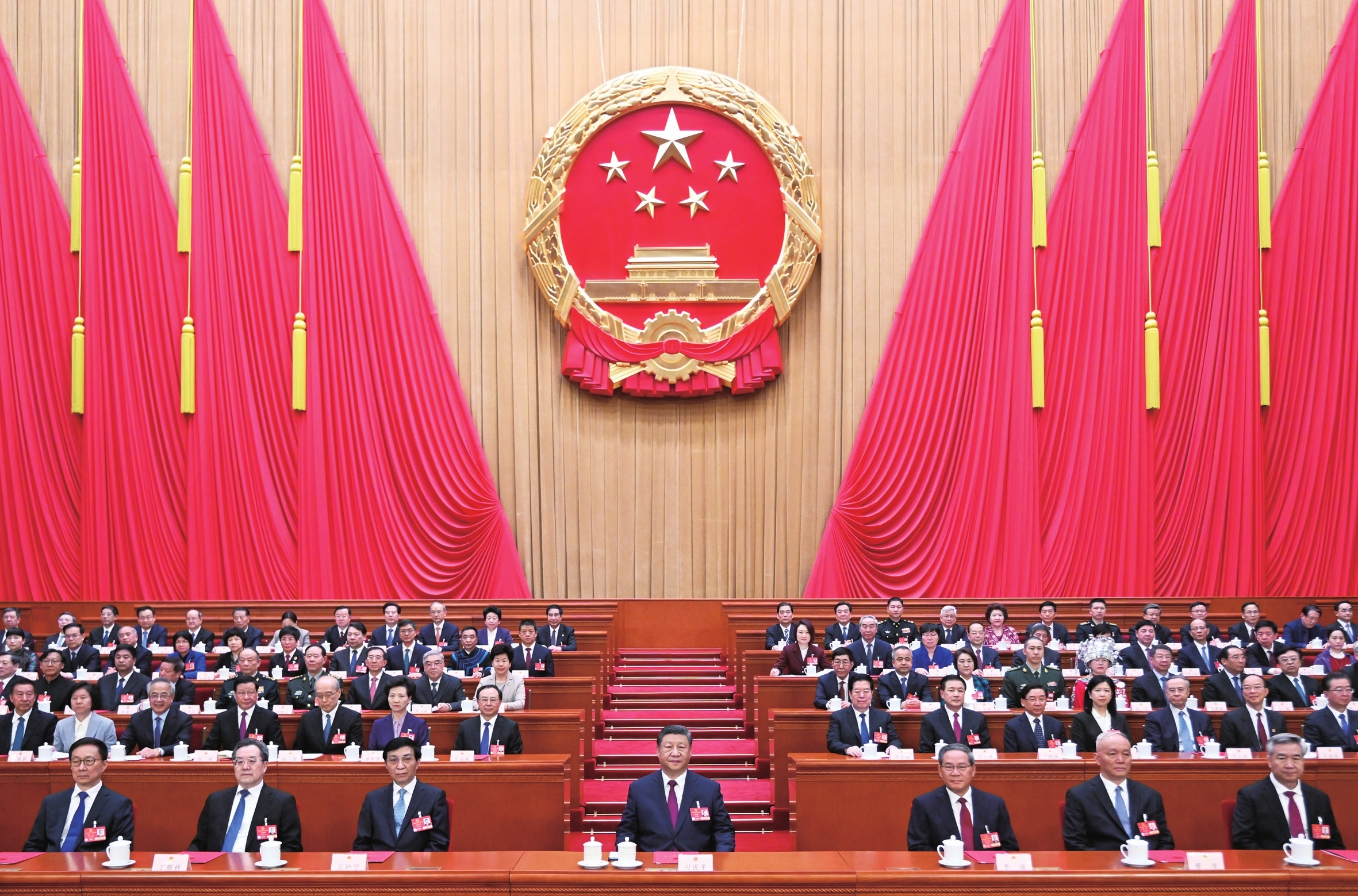 習(xí)近平、李強(qiáng)、王滬寧、蔡奇、丁薛祥、李希、韓正和大會(huì)主席團(tuán)成員在主席臺(tái)就座。